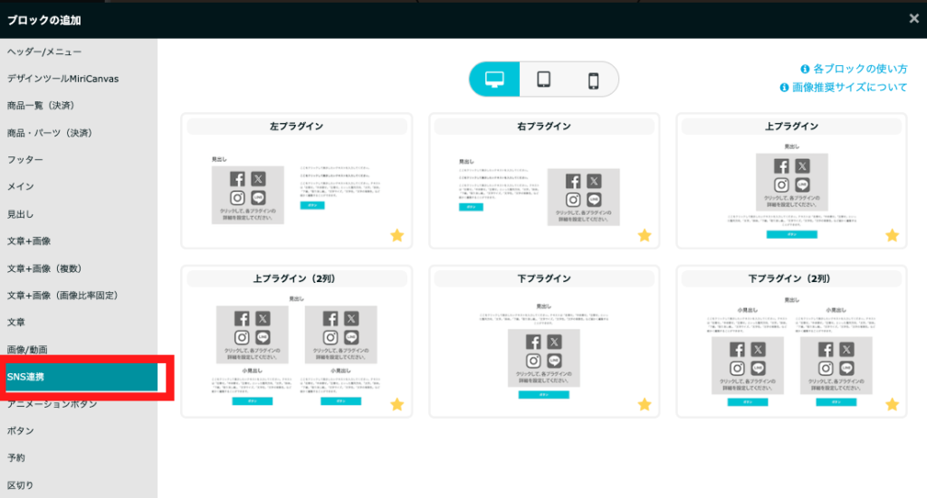 1.ペライチ側に移動し、ブロック追加画面で「SNS連携」を選びます。